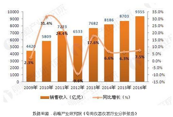 总体来看,近年来我国仪器仪表行业市场规模实现了快速扩张,销售收入已由2009年的4420亿元增至2016年的9355亿元。2013年以来,我国仪器仪表行业产品销售明显回暖,增速趋于稳定。2016年,我国仪器仪表行业销售增速为7.5%。