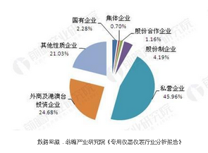 仪器仪表行业增速稳定的另一面,是国内外市场争夺进入白热化阶段,竞争较为激烈。截至2017年3月,我国规模以上仪器仪表制造企业有4311家。私营企业数量占比达到45.96%;外商及港澳台投资数量占比24.68%;股份制企业数量占比为4.19%;国有企业数量占比2.28%;股份合作企业和集体企业数量占比分别为1.16%和0.70%。